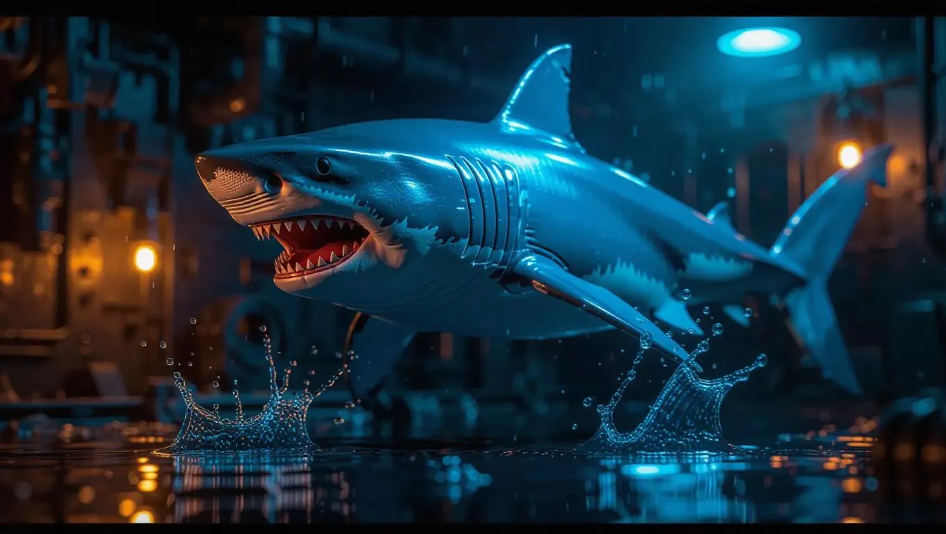 A 1:6 scale superhero shark figure in a dynamic underwater pose, wearing a sleek blue nano-suit with glowing gills and a plasma harpoon. Premium box inserts feature water splash effects and underwater ruins illustrations. Set against a high-energy toy prototyping chamber, illuminated with cool blue and green lights, hyper-realistic with a touch of comic book flair.