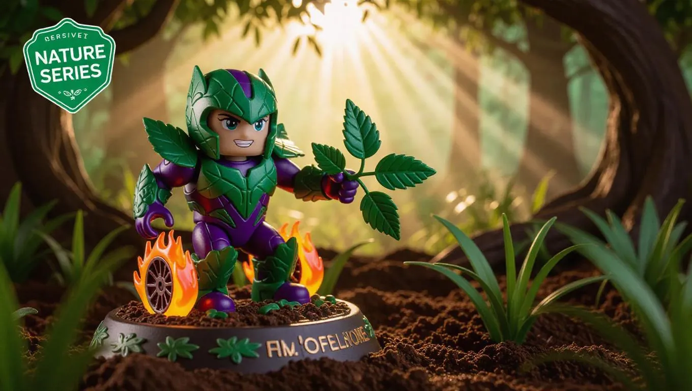 A nature-inspired racer toy figure with leaf armor, flame wheels, and floral designs. The figure stands on a base with soil and plant effects and whimsical art, featuring a “Nature Series” green badge. The background depicts a lush forest with sunlight filtering through trees, bathed in warm natural light casting dappled shadows. The style is serene and organic, emphasizing the harmony with nature and environmental beauty.