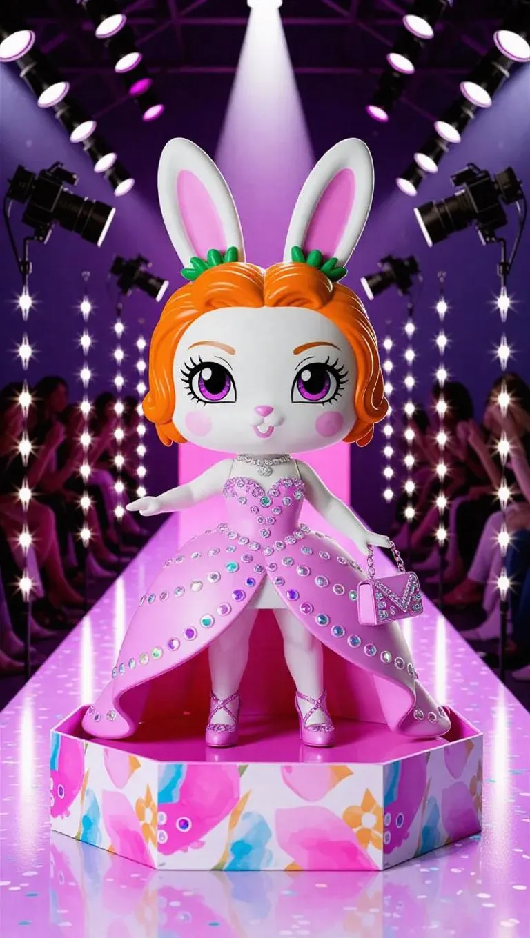 A candy-coated bunny action figure dressed as a diva, featuring carrot-topped ears, a glamorous gown, and high-heeled shoes. The toy box is adorned with watercolor-style fashion patterns and shimmering iridescent jewels, complete with miniature handbag accessories. The backdrop showcases a fierce runway filled with floating cameras and pastel-colored lights crafting glamour, bathed in spotlight light with a sprinkle of stardom. Style: Chibi anime with enchanting, fashionable charm.