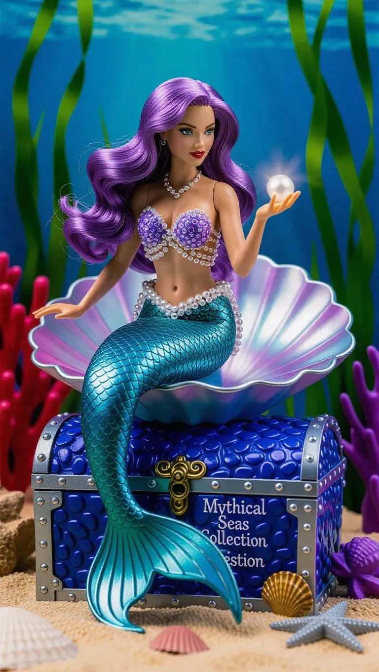 A highly detailed figure of a mermaid enchantress, her long, flowing lavender hair cascading over her shapely form. Seated on a large, iridescent seashell, her fishtail curls gracefully around her. Pearl-encrusted netting adorns her top, and her tail shimmers with scales in shades of teal and silver. Holding a glowing pearl, emitting a soft, otherworldly light. The toy box resembles an underwater treasure chest, textured like coral and seashells, with "Mythical Seas Collection" emblazoned on the front. Bright kelp forest background, teeming with playful dolphins and vibrant starfish. Gentle, filtered sunlight creates a dreamy, ethereal glow, enhancing the magical and whimsical elements.