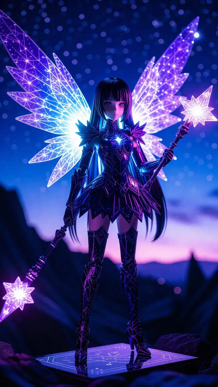 A magical girl action figure with iridescent crystal-like wings that catch the light beautifully, wielding a staff that glows with mystical energy when activated. Her eyes shimmer with crystal-shaped sparkles, and her outfit is an artistic blend of galaxy patterns. The toy box features intricate designs that replicate constellations, set against a backdrop of a deep twilight sky. Style: Realistic with a galactic fantasy vibe.
