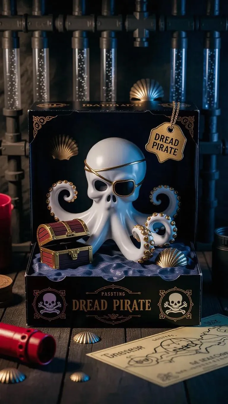 A ghostly pirate octopus toy with gold-plated tentacles, a treasure chest cannon, and a tattered eye-patch monocle. The box includes a haunting map insert, ghost shell tokens, and a foil "Dread Pirate" tag. Set against a factory background featuring a spooky underwater toy line with bubbly tubes and water pumps. Eerie, muted light illuminates the scene, casting dramatic shadows and highlighting the metallic sheen of the gold-plated tentacles. Realistic style with a touch of whimsy.
