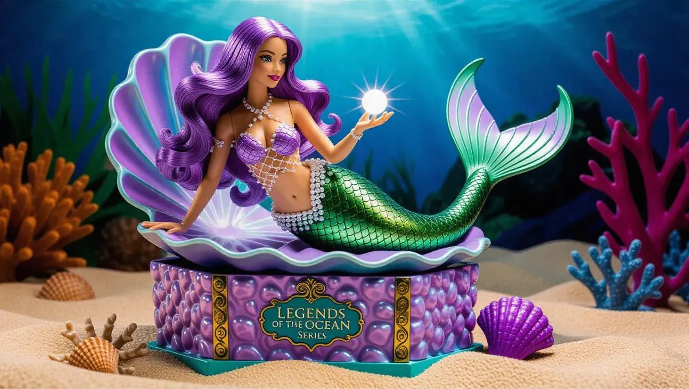 A highly detailed figure of a mermaid enchantress, her long, flowing lilac hair cascading over her shapely form. Seated on a large, iridescent seashell, her fishtail curls gracefully around her. Pearl-encrusted netting adorns her top, and her tail shimmers with scales in shades of green and gold. Holding a glowing pearl, emitting a soft, otherworldly light. The toy box resembles an underwater treasure chest, textured like coral and shells, with "Legends of the Ocean Series" emblazoned on the front. Dreamy lagoon background, teeming with shimmering fish and fantastic coral formations. Gentle, filtered moonlight creates a dreamy, ethereal glow, enhancing the magical and tranquil elements.