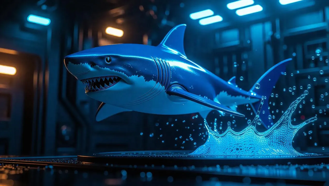 A 1:6 scale superhero hammerhead shark figure in a dynamic underwater pose, wearing a sleek blue nano-suit with glowing gills and a plasma harpoon. Premium box inserts feature water splash effects and comic-style bubbles. Set against a high-energy toy prototyping chamber, illuminated with deep blue and aqua lights, hyper-realistic with a touch of comic book flair.