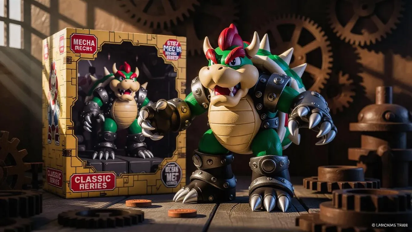 A steam-powered, anime-inspired toy figure of Bowser as a plumber-bot, featuring weathered steel pipes, jet boots, and claw arms. The premium packaging showcases pixelated coin textures, grid overlays, and a “Classic Mecha Series” sticker. Set against a medieval toy workshop with ancient gears, the scene is bathed in muted, nostalgic light with elongated shadows, enhancing the retro-futuristic aesthetic.