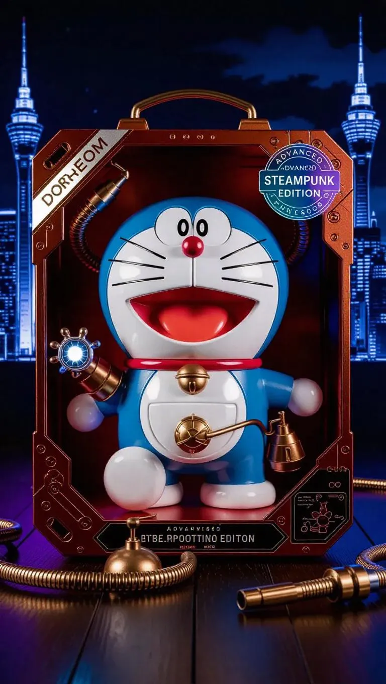 A steampunk-inspired collectible action figure of Doraemon, packaged in a futuristic-style toy box. Doraemon features a sleek copper and lead redesign with brushed metal accents, glowing silver eyes, and synthetic fibers. His round body is detailed with steam vents and electric mechanisms, and his bell and pouch are upgraded with streamlined designs. The packaging showcases minimalist fonts, digital action poses, and a holographic 'Advanced Steampunk Edition' sticker. Included accessories: electric gadget arm, digital device. Background: retro-futuristic Kobe skyline at midnight, high detail, stark lighting, cool colors.