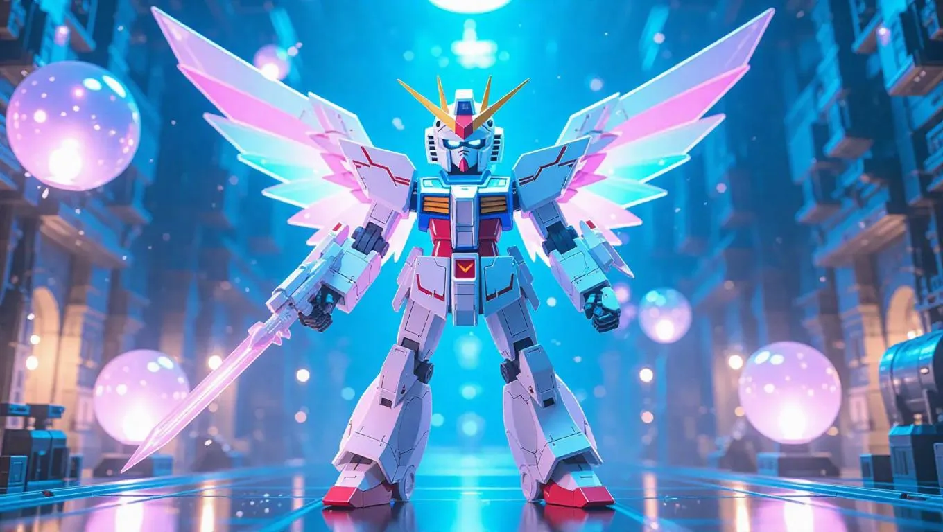 A high-gloss white and coral robotic Sailor Prismo mech figure with crescent moon wings and a prism-launching wand stands prominently. The packaging is adorned with prism-themed designs and crescent moon-shaped holographic labels, featuring bonus gear arms. The background showcases a magical toy factory filled with floating mechanical prisms and a whimsical, celestial atmosphere. Soft, warm light casts gentle highlights, enhancing the figure’s glossy finish. Style: Cute and futuristic with a touch of cyberpunk flair.