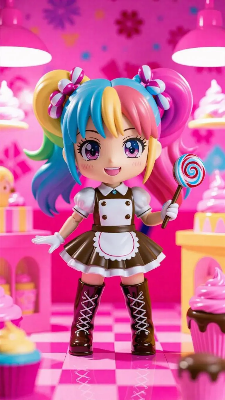 A candy-colored anime girl action figure, dressed as a sweet dream chef, sports frosting-themed hair, a fudge wand, and sumptuous chocolate boots. The toy box showcases glossy swirls and shiny candy-coated patterns, along with bonus mini-figures. The background depicts a whimsical factory creating sweets-themed toys, bathed in cozy, gentle light with a touch of radiant highlights. Style: Chibi anime with a vibrant, colorful aesthetic.