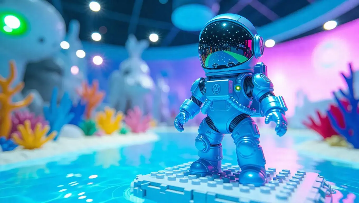 A toy astronaut with striking blue armor and crystal-clear visors stands on a simulated ocean world surface platform within its packaging. The box showcases marine-themed logos and a detachable aquatic adventure checklist. In a vibrant toy exhibit hall, the scene is illuminated by bright, aqua lights and flashing-green indicators, casting playful, wavy shadows. The setting highlights an immersive, aquatic design, blending fun with marine aesthetics.
