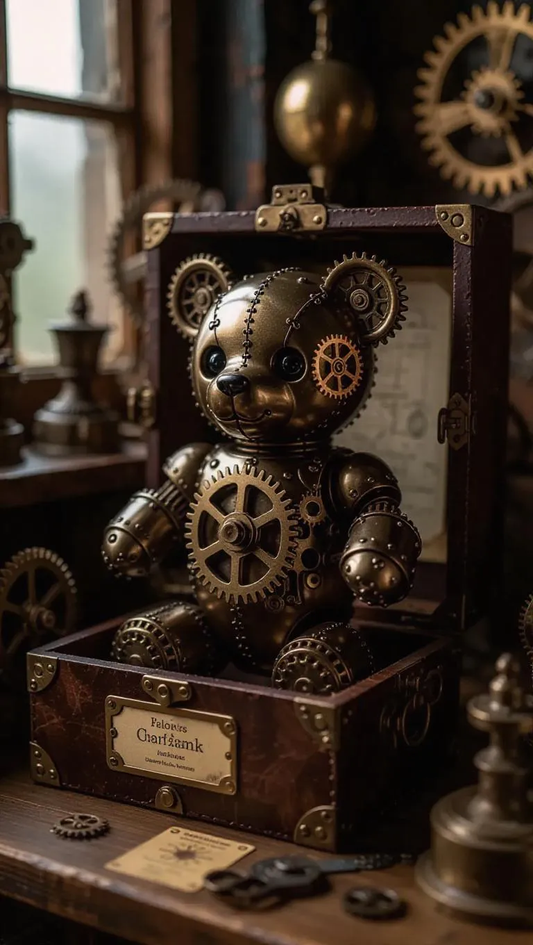 A steampunk teddy bear toy crafted from bronze gears, leather straps, and cogwheel eyes, featuring a winding key on its back. It stands in a collector’s box with rustic textures, a faux-leather label, and a brass-colored window frame. The scene is set inside a vintage toy workshop, surrounded by schematics and tools. Soft, warm light filters through the windows, casting gentle shadows and highlighting the intricate details of the bear and the workshop. The style is realistic, emphasizing the tactile and mechanical elements.