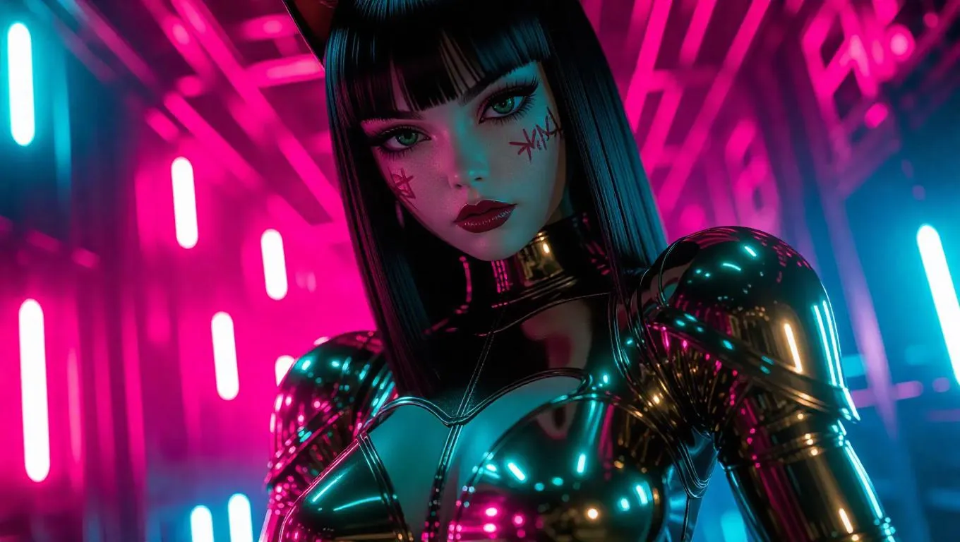 A futuristic catgirl action figure, with a retractable tail whip and a shimmery gold bodysuit, features bright red tattoos on her thighs. Her medium-length black hair and sharp green eyes enhance her edgy persona. The packaging glows with electric teal neon patterns and has magnetic seal panels. Set against an ultra-modern toy factory backdrop, with sparks, flying drones, and energy grids embedded in the walls. Lighting is crisp and focused, creating high contrast shadows and highlights. Style: Sci-Fi, Cyberpunk.