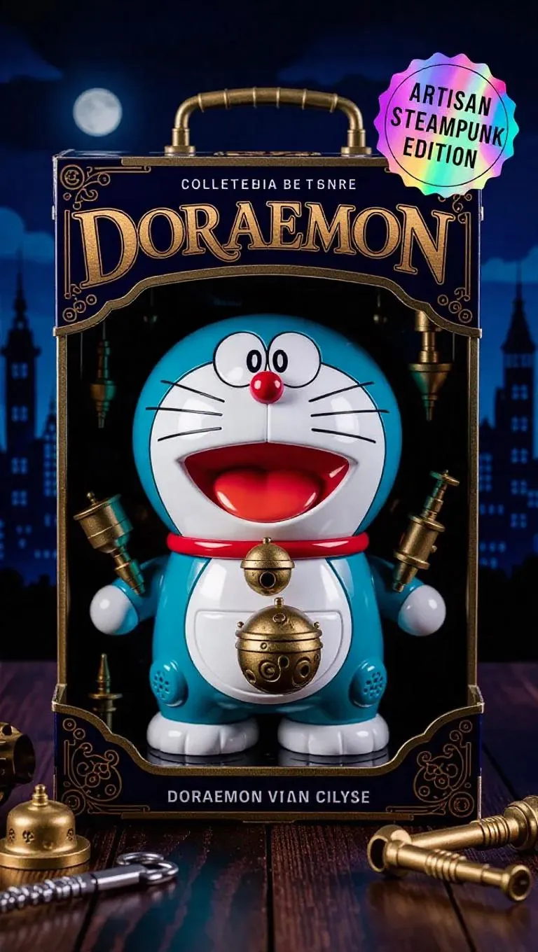 A steampunk-inspired collectible action figure of Doraemon, packaged in an artistic toy box. Doraemon features a creatively painted brass redesign with unique patterns, glowing teal eyes, and mixed-media accents. His round body is detailed with steam vents and playful mechanisms, and his bell and pouch are upgraded with artistic flair. The packaging showcases innovative fonts, imaginative action poses, and a holographic 'Artisan Steampunk Edition' sticker. Included accessories: artistic gadget arm, crafted tools. Background: retro-futuristic Gifu skyline at midnight, high detail, artistic lighting, dreamlike tones.