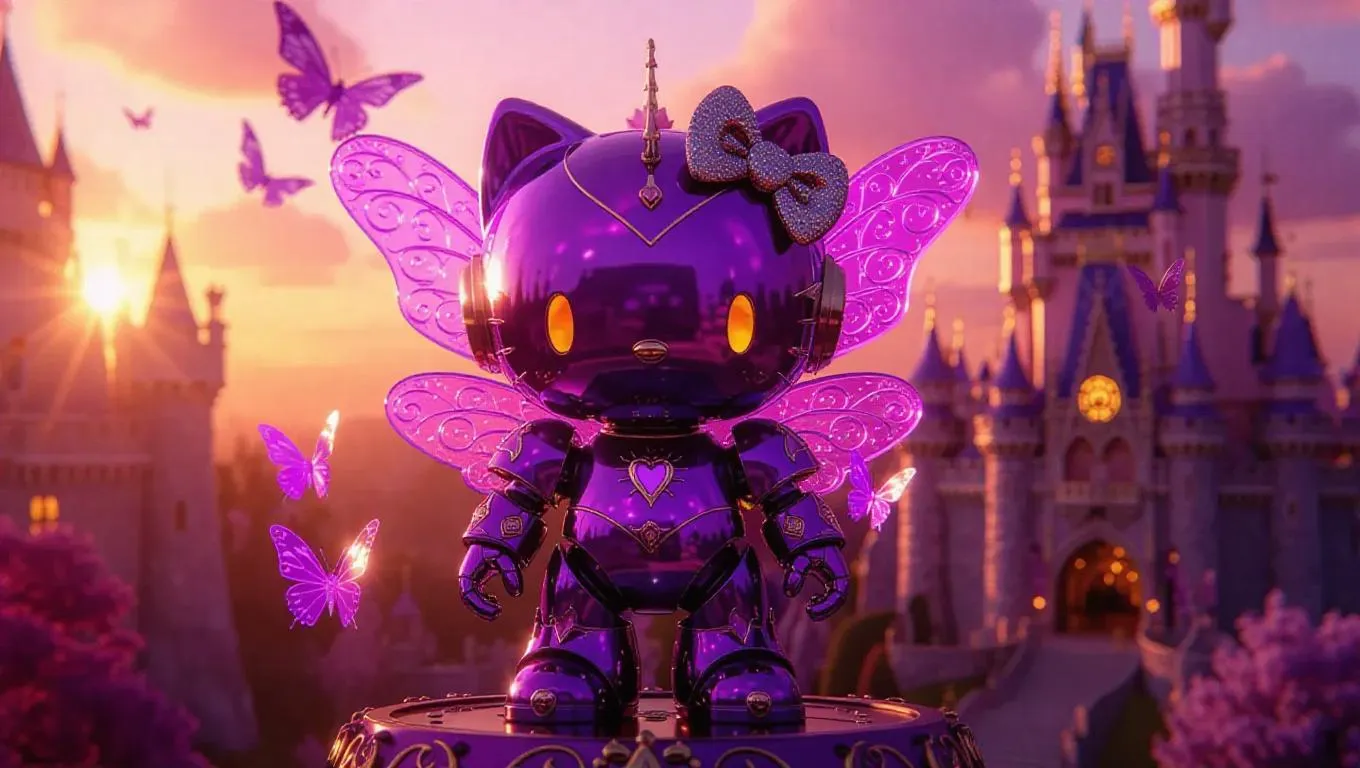An opulent purple and gold robotic Hello Kitty mech figure with fairy ears and a sparkly bow stands prominently. The figure's packaging showcases magic-themed designs and wand-shaped holographic labels, including accessory gear charms. The background presents an enchanting toy castle, filled with floating mechanical butterflies and a whimsical, fantastical atmosphere. Warm, enchanting light casts gentle highlights on the figure, enhancing its luxurious detail. The style merges fairy tale elegance with a modern twist.