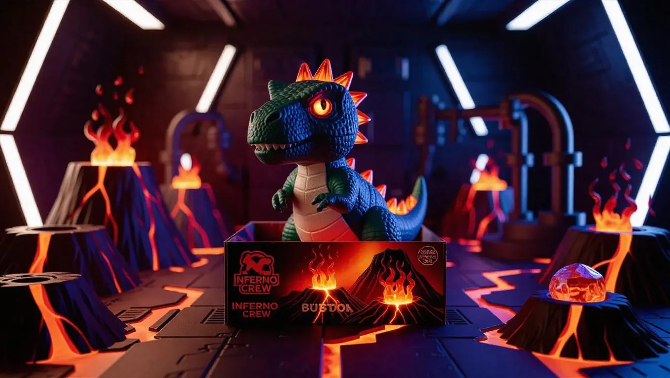 A chibi dinosaur toy in lava armor with translucent fire spikes and glowing red eyes, posed in a thoughtful stance. The toy box features erupting volcano graphics and "Inferno Crew" branding, including a collectible heated stone. Set in a lab with an advanced production facility, bubbling lava tubes, and glowing cracks, the scene is illuminated by sharp, intense light creating focused shadows. Style: sleek and futuristic, with a bit of intrigue.