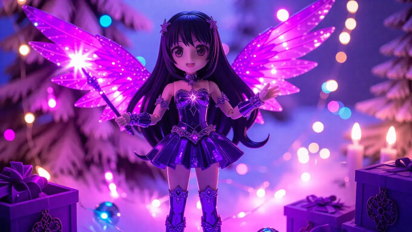 A magical girl action figure with luminous violet wings, a magic wand, and bright eyes stands in a joyous pose. Her toy box is embellished with twinkling gems and features her in a jubilant magical stance, complete with additional sparkle twirl accessories. The background is a celebratory toy workshop, basked in festive, colorful light that enhances the colors and creates a joyous ambiance. Style: Realistic with joyful fantasy.