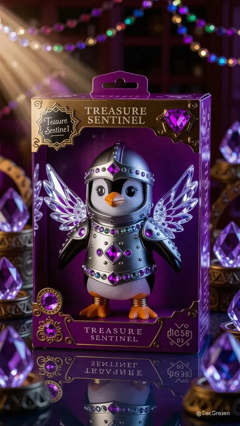 A toy knight penguin with crystal wings, a platinum helmet, and armor adorned with gemstones stands proudly. The packaging features reflective textures, jewel runes, and a “Treasure Sentinel” badge. Set against a treasure-themed toy factory backdrop, the scene includes glittering gem chambers. Soft, diffused lighting casts a sparkling, multicolored hue, enhancing the luxurious atmosphere. The style is whimsical and detailed, blending realism with a touch of extravagance.