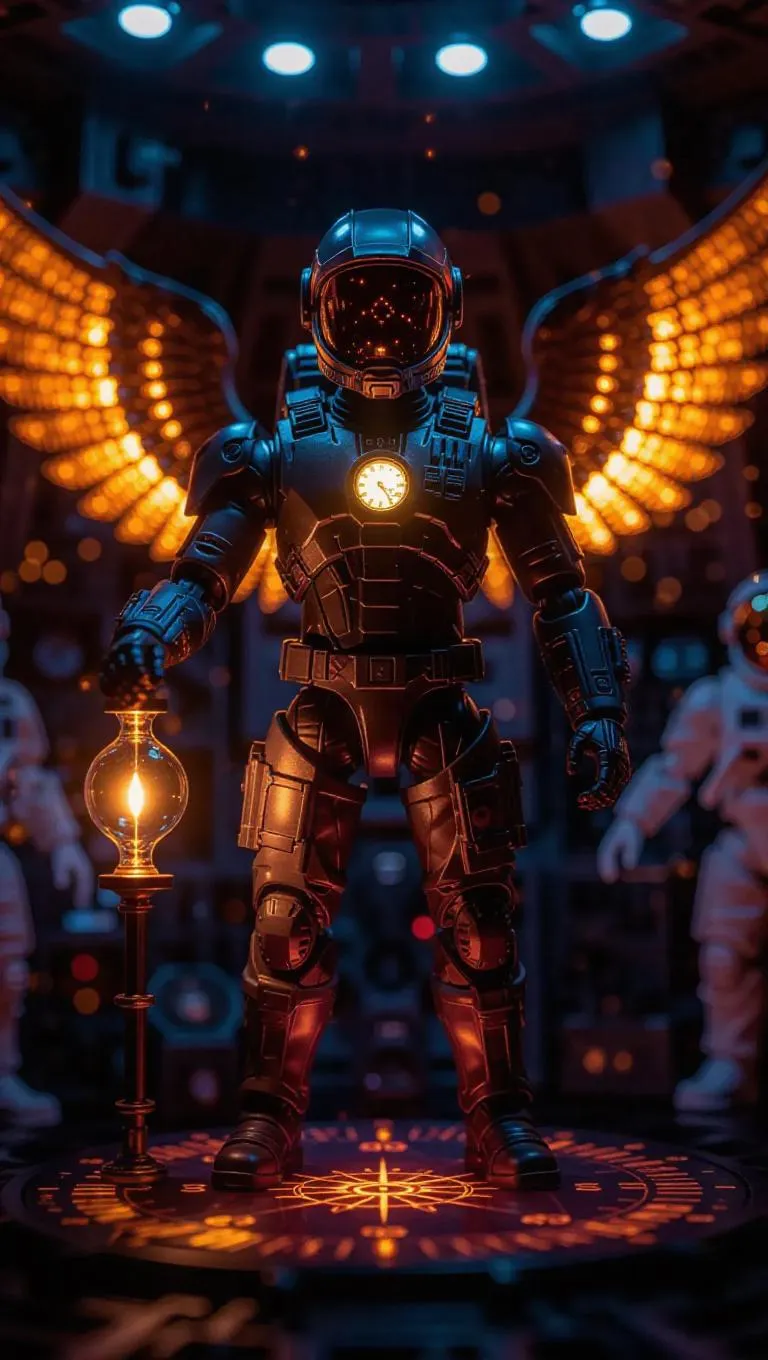 A time traveler action figure with intricate clock-shaped wings and an hourglass staff glowing with radiant golden light. Wears a space suit adorned with mission badges. The toy box showcases a planetarium design. Background: A futuristic space station filled with astronauts, equipment, and starlit views. Style: Interstellar exploration.