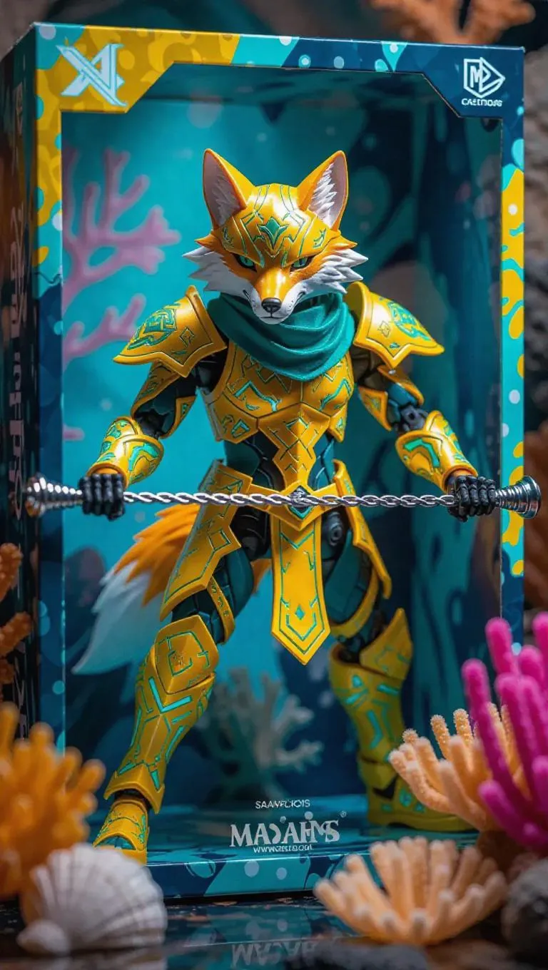 A sleek fox warrior toy clad in yellow and teal armor with intricate lightning motifs, wielding a pair of nunchaku. The box showcases an underwater scene with coral reefs and Greek letters, including a net pouch for accessories. Set in an oceanic workshop with seashell tools and murals, illuminated by sparkling water, enhancing the toy's dynamic design. Style: Realistic.