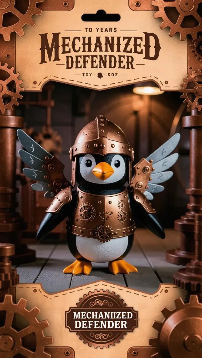 A toy knight penguin with metal wings, a bronze helmet, and armor adorned with gears stands proudly. The packaging features steampunk textures, clockwork runes, and a “Mechanized Defender” badge. Set against a factory-themed toy factory backdrop, the scene includes whirring machine chambers. Soft, diffused lighting casts a rugged, copper hue, enhancing the industrial atmosphere. The style is whimsical and detailed, blending realism with a touch of technology.