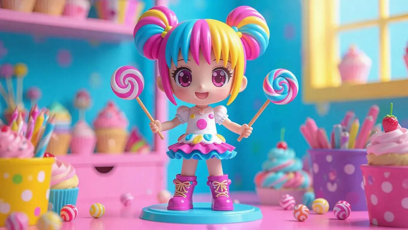 A candy-colored anime girl action figure, dressed as a vibrant dessert artist, sports frosting-themed hair, a berry wand, and buttery boots. The toy box showcases cheerful swirls and shiny happy candy patterns, along with bonus mini-figures. The background depicts a joyful toy workshop creating sweets-themed toys, bathed in uplifting, soft light with a touch of radiant highlights. Style: Chibi anime with a joyful, colorful aesthetic.