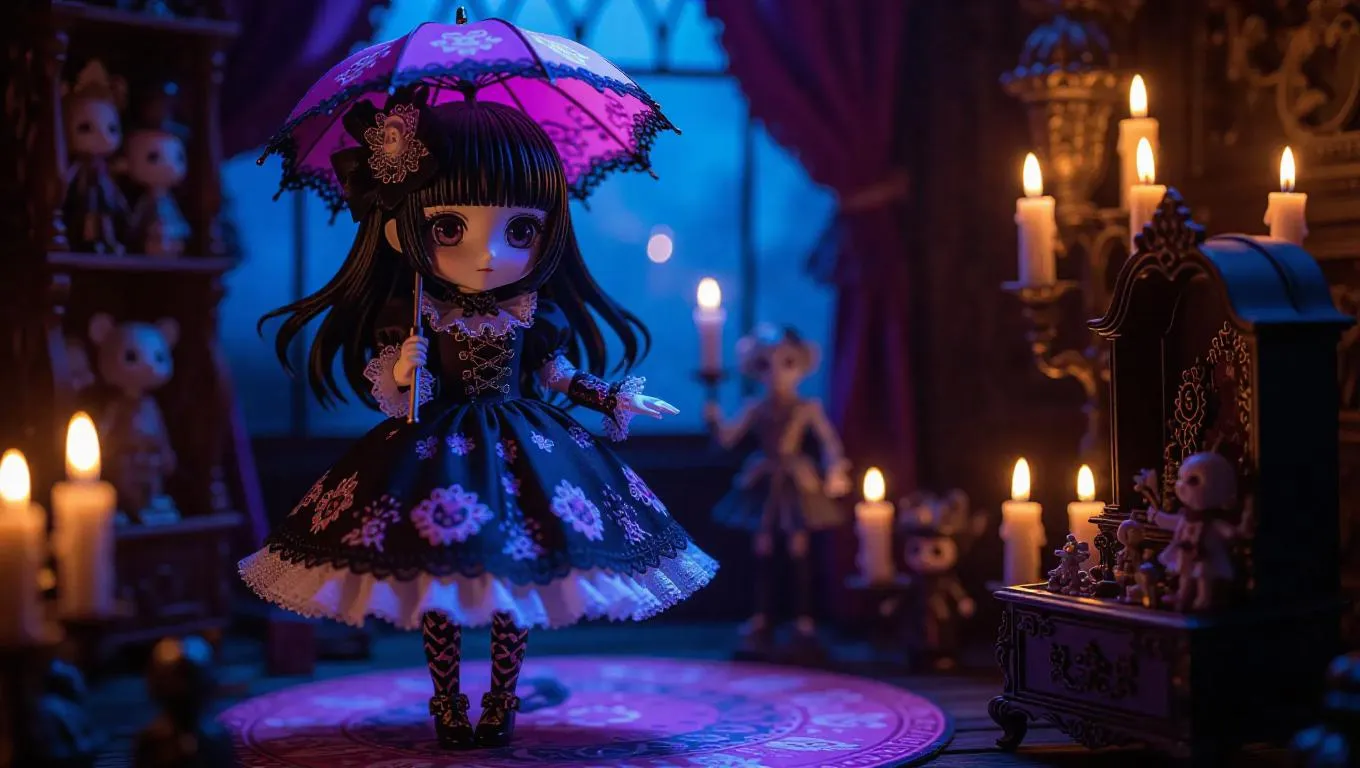A gothic lolita action figure, whimsical and colorful, dressed in a lavish dress adorned with intricate toy and puppet motifs. Wields a parasol that transforms into a music box. Toy box showcases a hauntingly beautiful toy store surrounded by playful spirits. Background: A shadowy stage with flickering candles casting whimsical shadows.