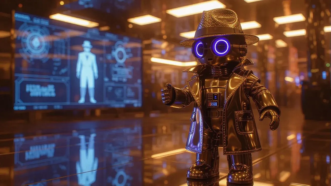 A toy detective droid with a holographic eye that displays augmented reality, a trench-coat made of reflective material, and a fedora built with a communicator. Shimmering-gold body with violet accents, space-themed detective features. Dynamic crime-scene hub with virtual projections and 3D footprints, space-themed silhouette of a hidden figure. Bright white-toned lighting, cosmic atmosphere, futuristic style.