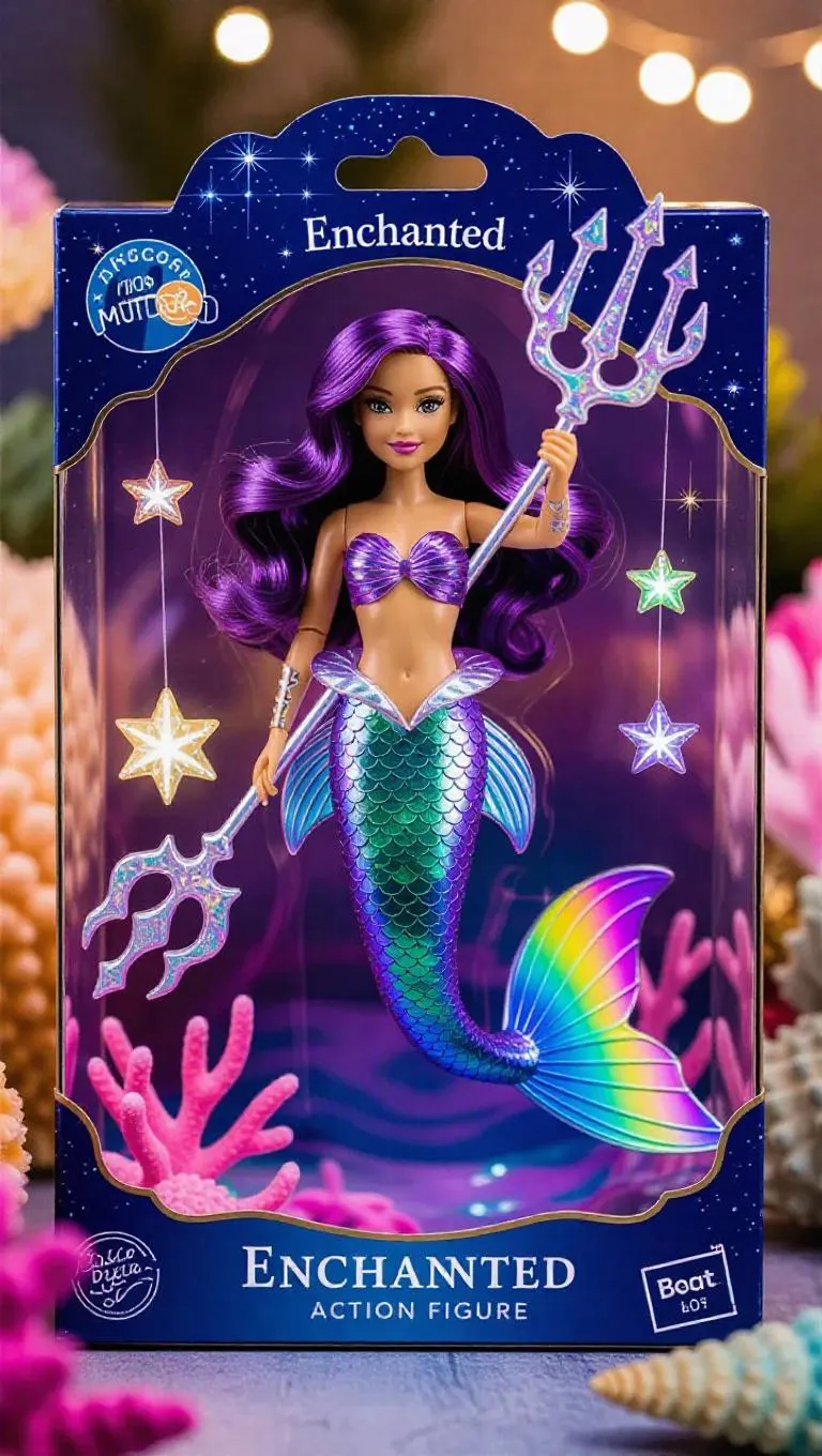 A galaxy-themed mermaid action figure with multi-colored fins and luminous star freckles, holding an astral trident. The packaging features celestial patterns, rainbow-tinted foil, and underwater accessories. The background showcases a toy factory shaped like a giant sea urchin, illuminated by the soft, twinkling starlight. Natural, soft front light enhances the mermaid's brilliant scales and the holographic packaging, creating a magical and serene atmosphere. Style: Enchanted realism.