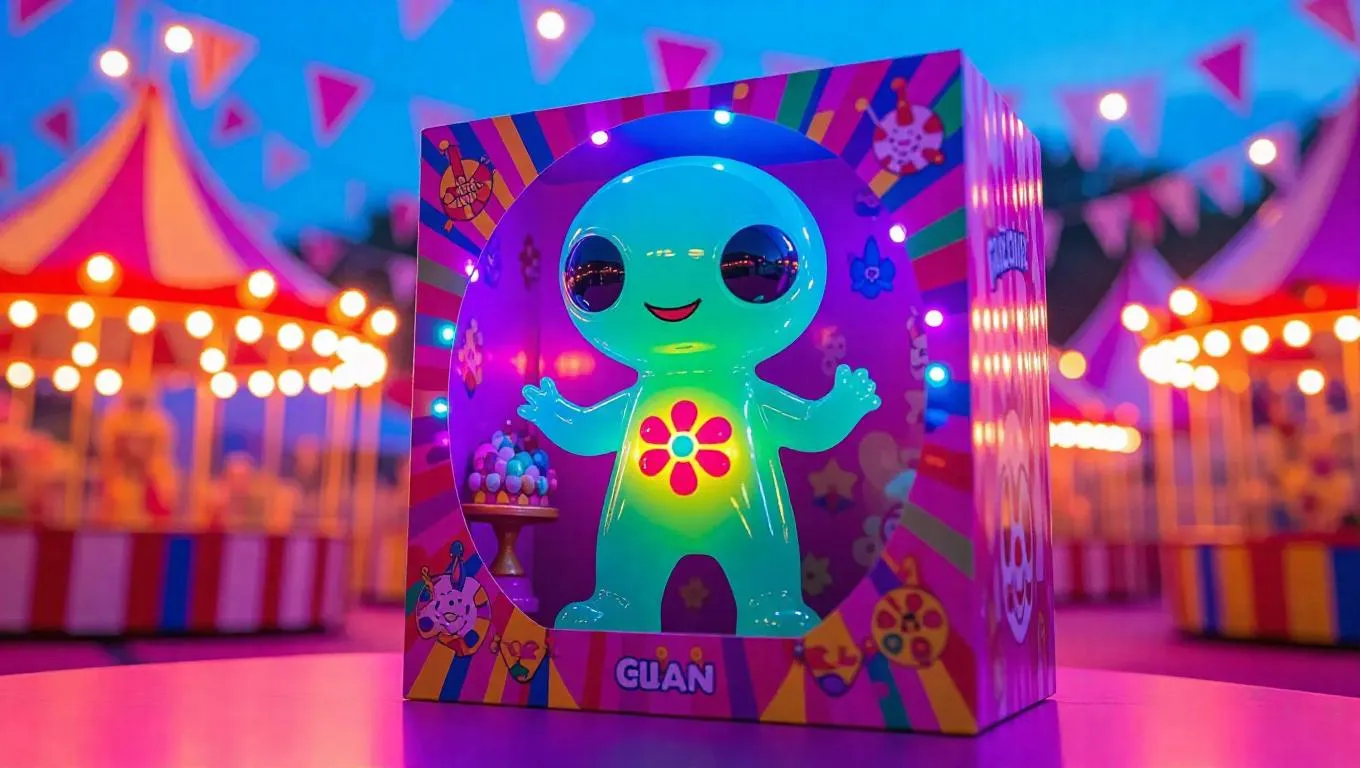 A toy alien jelly figure made of luminescent gelatin material, showcasing bright eyes and shimmering trails. The box is decorated with circus-themed graphics, including a clown-shaped accessory and vibrant colors. The factory setting is a thrilling carnival toy zone, filled with colorful tents and game booths. Bright, playful lighting enhances the gelatinous texture, creating an exciting and joyful atmosphere. The style is lively and slightly playful, blending circus elements with whimsical designs.