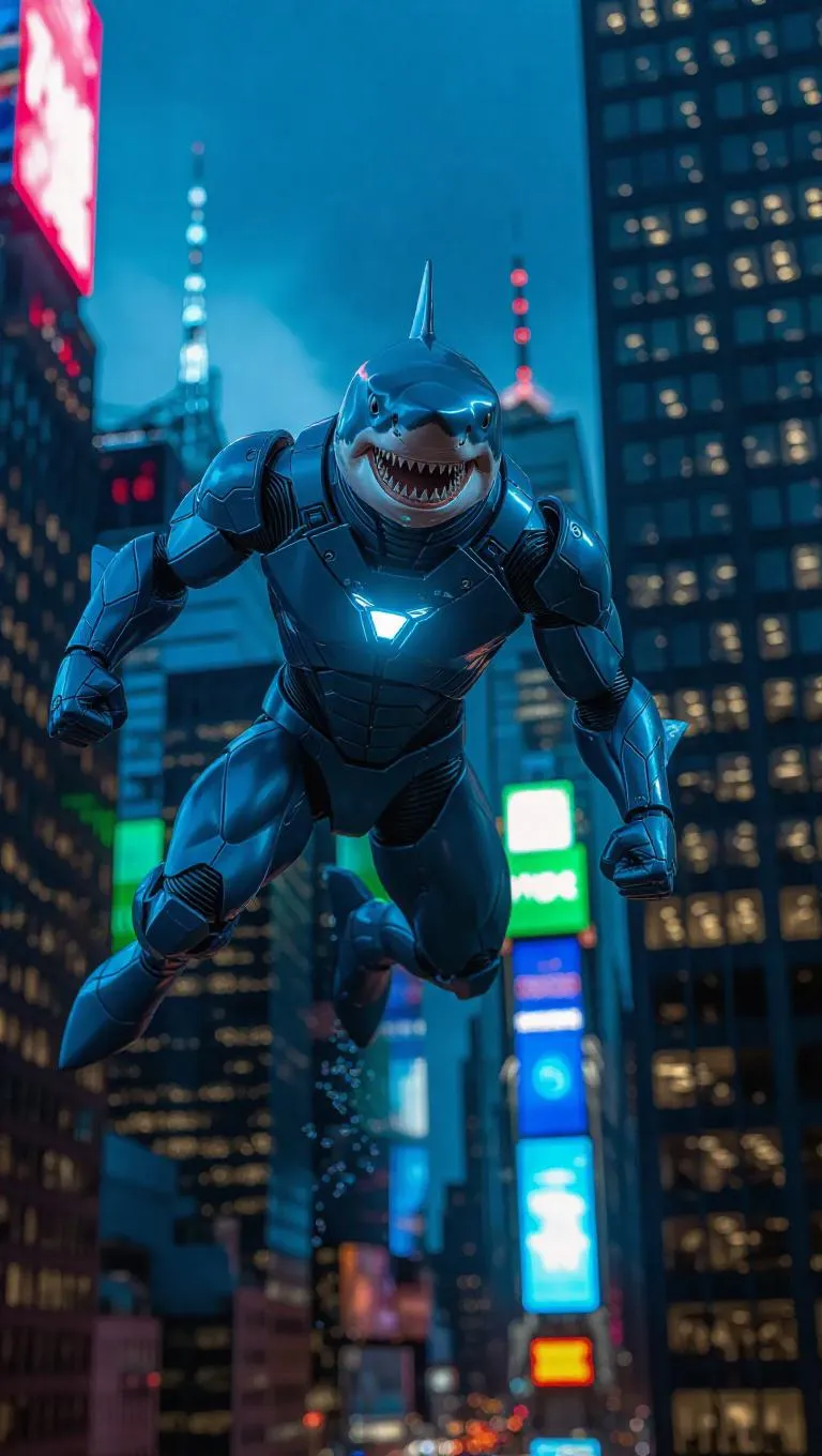 A 1:6 scale superhero shark figure in a mid-air pose, wearing a sleek blue nano-suit with glowing gills and a plasma harpoon. Premium box inserts feature water splash effects and comic-style bubbles. Set against a futuristic city skyline at dusk, illuminated with cool blue and green lights, hyper-realistic with a touch of comic book flair.