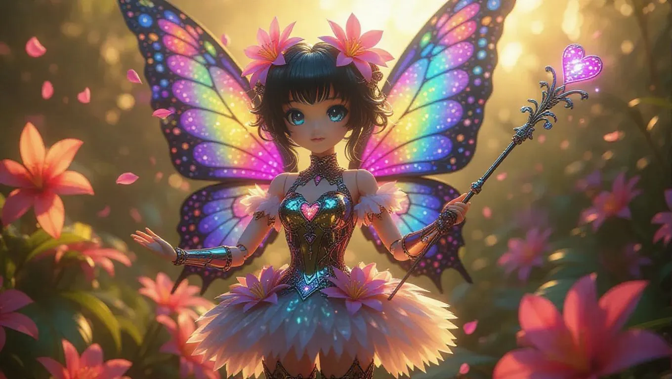 A magical girl action figure with radiant butterfly wings that shimmer and alternate colors under the light, wielding a magic wand that releases a flurry of petals when activated. Her eyes are adorned with twinkling heart-shaped glimmers, and her outfit is an enchanting mix of colors and patterns inspired by tropical flowers. The toy box features elaborate floral carvings, set against a backdrop of a sunny meadow bursting with vibrant blooms. Style: Realistic with a floral fantasy vibe.