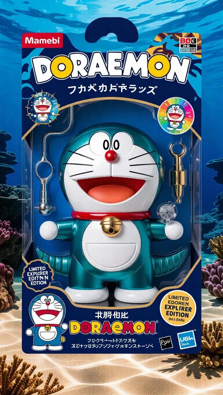 An anime-inspired collectible action figure of Doraemon in an underwater explorer design, packaged inside a premium toy box. Doraemon has a sleek, robotic redesign with shiny metallic teal armor, glowing blue eyes, and mechanical fins. His signature round body is now detailed with tech panels and aquatic elements, and his iconic bell and pouch are upgraded with diving features. The packaging features bold Japanese anime-style fonts, cel-shaded illustrations of Doraemon in action poses, and a holographic “Limited Explorer Edition” sticker. The box includes accessory parts like a diving helmet and a harpoon tool. Background features an oceanic reef skyline at midday. Style: anime-explorer, cel-shaded, high detail, collectible figure with toybox glare and dramatic lighting.