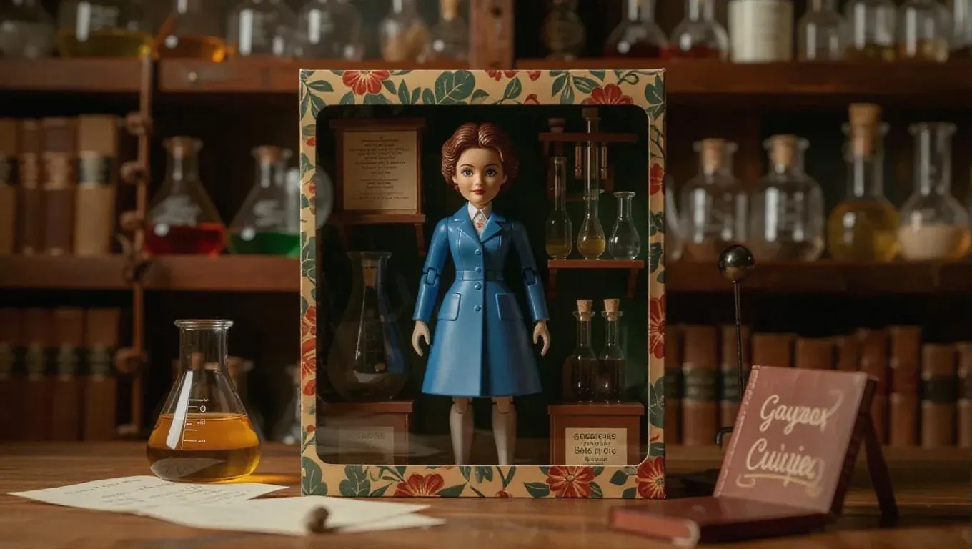 A realistic product photograph of an action figure box set featuring Marie Curie. The action figure is packaged inside a retro science-themed cardboard box with a clear front window. Include relevant assets/accessories such as: miniature laboratory glassware, a science book, crumpled notes. The figure itself looks detailed, slightly stylized, with her characteristic hairstyle. High-quality lighting, clean background, studio style, product photography