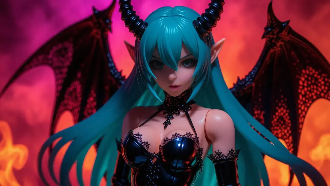 A seductive demon girl action figure with shadowy black horns, feathered wings, and a metallic blue latex outfit adorned with black lace. Her long, flowing teal hair shimmers, and her dark green eyes have an ominous shine. The toy packaging features dark sigils, rich velvet textures, and a transparent blood-stained window. In the factory, fiery molds and swirling vapors surround the assembly lines, creating a forbidden, macabre atmosphere. Lighting is subdued with bright highlights and deep shadows. Style: Dark Fantasy, Gothic.