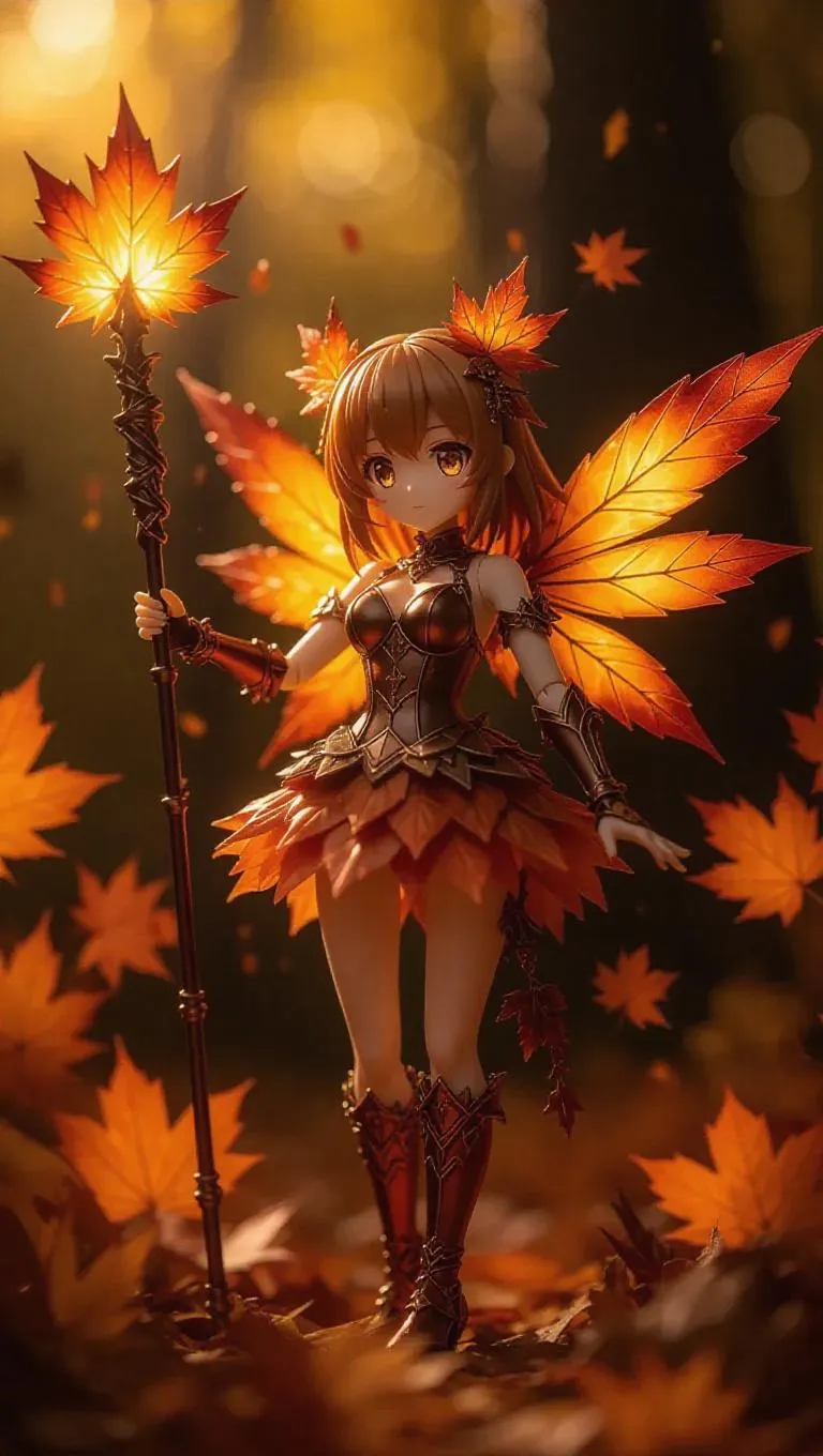 A magical girl action figure with glimmering autumn leaf wings that change shades in the light, wielding a staff that releases falling leaves when activated. Her eyes are adorned with leaf-shaped sparkles, and her outfit embodies the colors of fall foliage. The toy box is reminiscent of autumn, featuring leaf designs, set against a background of a forest during fall, with golden sunlight filtering through the trees. Style: Realistic with an autumnal fantasy vibe.