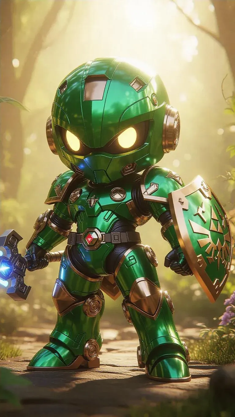 A high-gloss green and copper robotic Link mech figure with Master Sword, shield, and Triforce-launching bow stands prominently. The packaging features nature-themed designs and shield-shaped holographic labels, including bonus gear arms. The background is a lush garden with floating mechanical arrows, mystical lights, and an adventurous atmosphere. Soft, golden light enhances the figure's glossy finish, blending cute and futuristic aesthetics with an earthy tone.