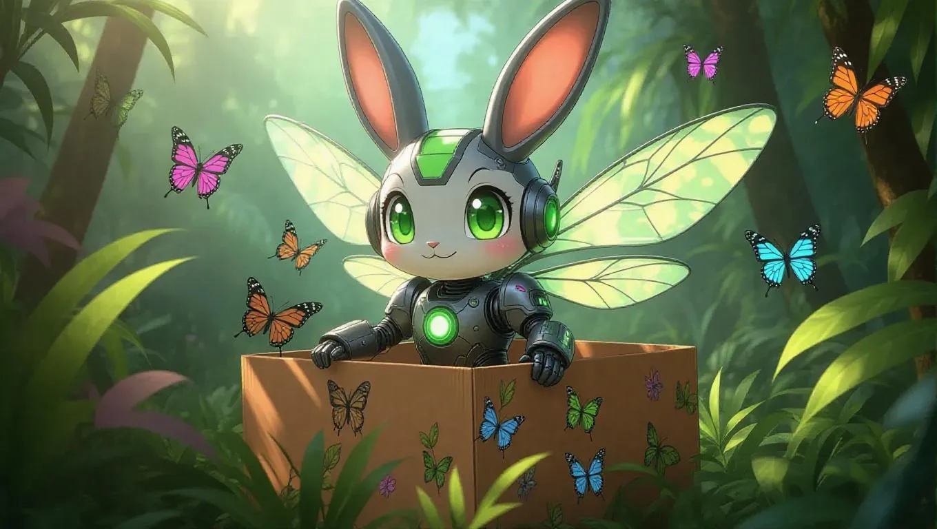 An anime-styled robot bunny with dragonfly wings, a jetpack tail, and chartreuse eyes stands in a jungle-themed box adorned with vines, glowing stickers, and animal decals. The background features a bunny-themed animal sanctuary, with floating butterflies adding a whimsical touch. Soft, dappled light enhances the green colors, creating a lively and vibrant atmosphere. The style is playful and cartoonish, with clean lines and exaggerated features.