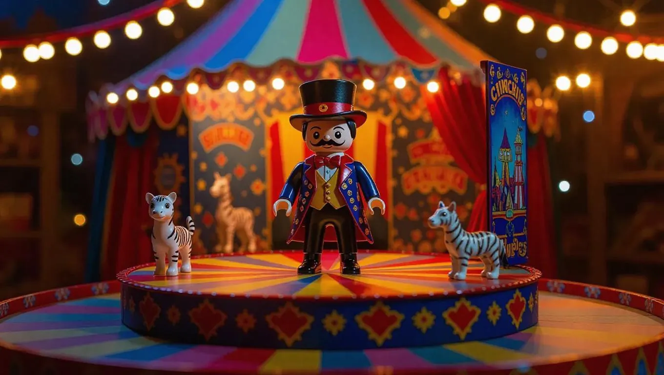 A toy circus ringmaster in a flamboyant coat and top hat stands on a circus ring-shaped platform inside his box. The packaging features a vibrant circus poster design and a secret drawer filled with miniature animal figurines. Set in a carnival-themed toy workshop, the scene shines with the colorful glow of carnival lights and the sparkling reflection of confetti, evoking a lively and entertaining atmosphere. The style blends realism with circus-adventure elements.