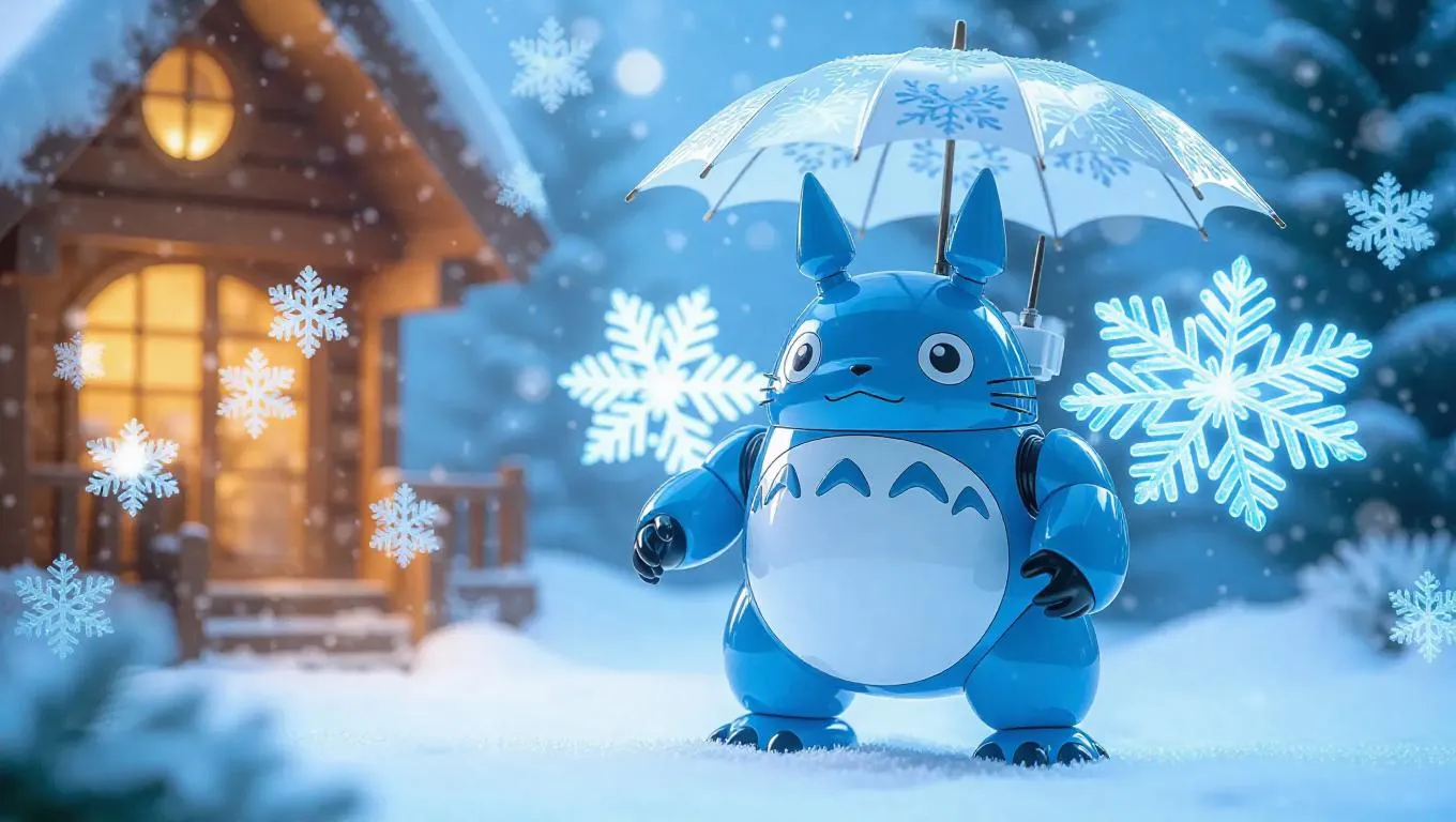 A high-gloss white and blue robotic Totoro mech figure with cloud wings and a wind-launching umbrella stands prominently. The packaging features winter-themed designs and snowflake-shaped holographic labels, including bonus gear shields. The background showcases a cozy toy cabin with floating mechanical snowflakes and a tranquil, winter-inspired atmosphere. Soft, crisp light casts gentle highlights, enhancing the glossy finish. Style: Cozy and serene with a touch of Nordic flair.