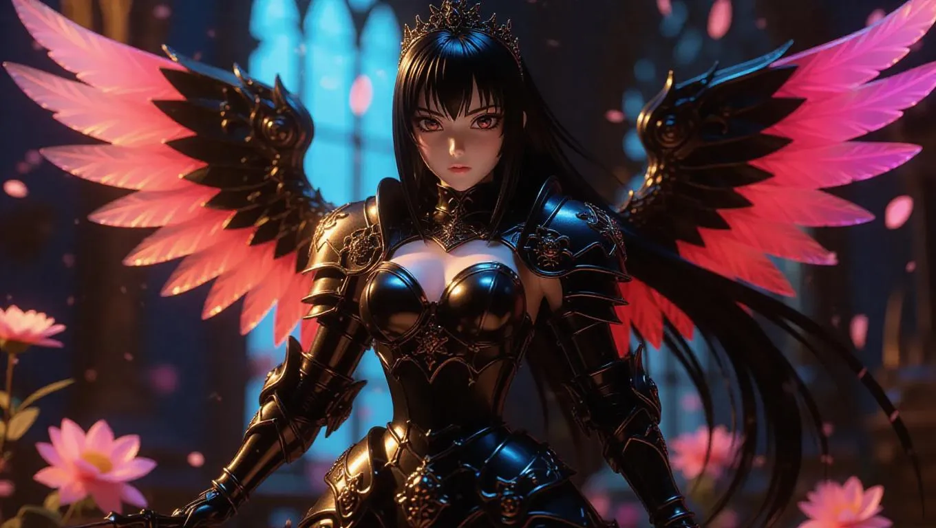 An anime warrior princess action figure with sparkling wings and armor wraps flows off her robust body. Jet black hair cascades down her back, and her radiant skin glows under regal, bright front lighting. The toy box features floral motifs, bronze accents, and a crystal-clear window shaped like shields. In a medieval scene, enchanted toy parts float midair under royal, soft side lighting. Style: Epic Fantasy, Chivalric.