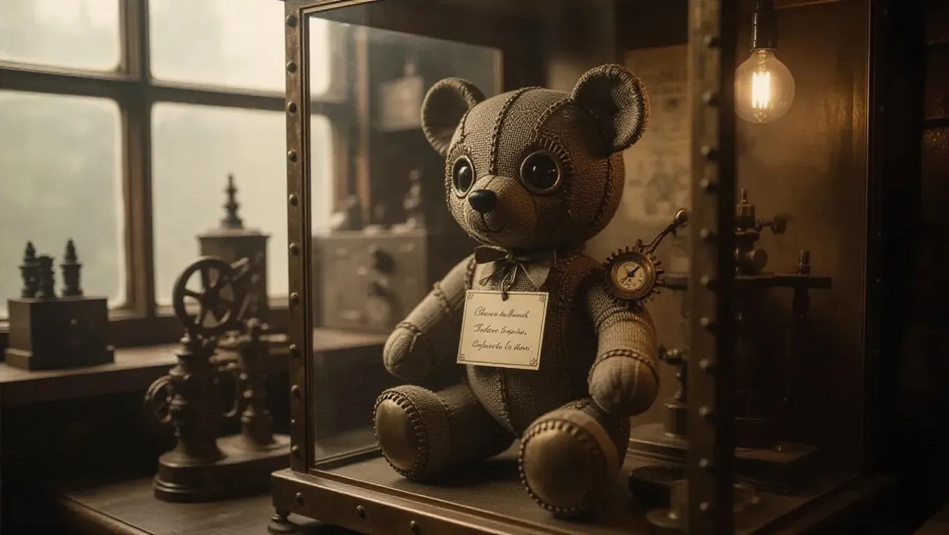 A steampunk teddy bear toy made from textured copper, linen wraps, and beam eyes, featuring a winding key on its back. It stands in a display case with smooth textures, a faux-fabric label, and a translucent window frame. The scene is set inside a vintage toy workshop, surrounded by vintage designs and apparatus. Soft, calming light filters through the windows, casting soft shadows and emphasizing the exquisite details of the bear and the workshop. The style is realistic, highlighting the tactile and mechanical elements.
