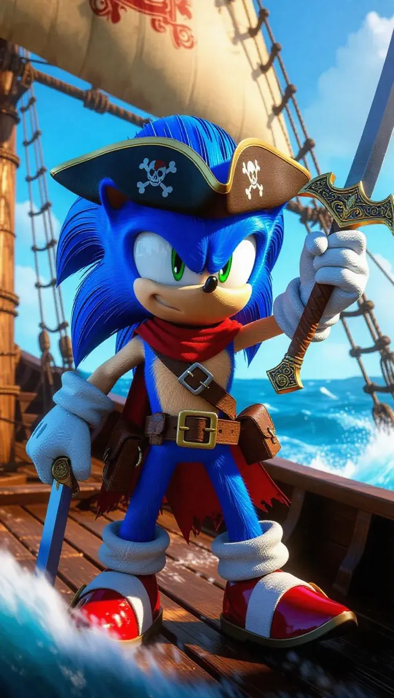 Sonic the Hedgehog, imagined as a pirate captain, wears tattered shoulder cloths, a cutlass tail-blade, and a tri-corner hat. Dynamic anime-style motion lines and treasure maps adorn the box art. The scene is set on a swaying ship with turbulent seas and fluttering flags. Warm sunlight highlights the rustic clothing and adds a vibrant touch to the stormy, blue ambient lighting. The style blends realistic and anime aesthetics, highlighting the combination of high-seas adventure and modern animation.