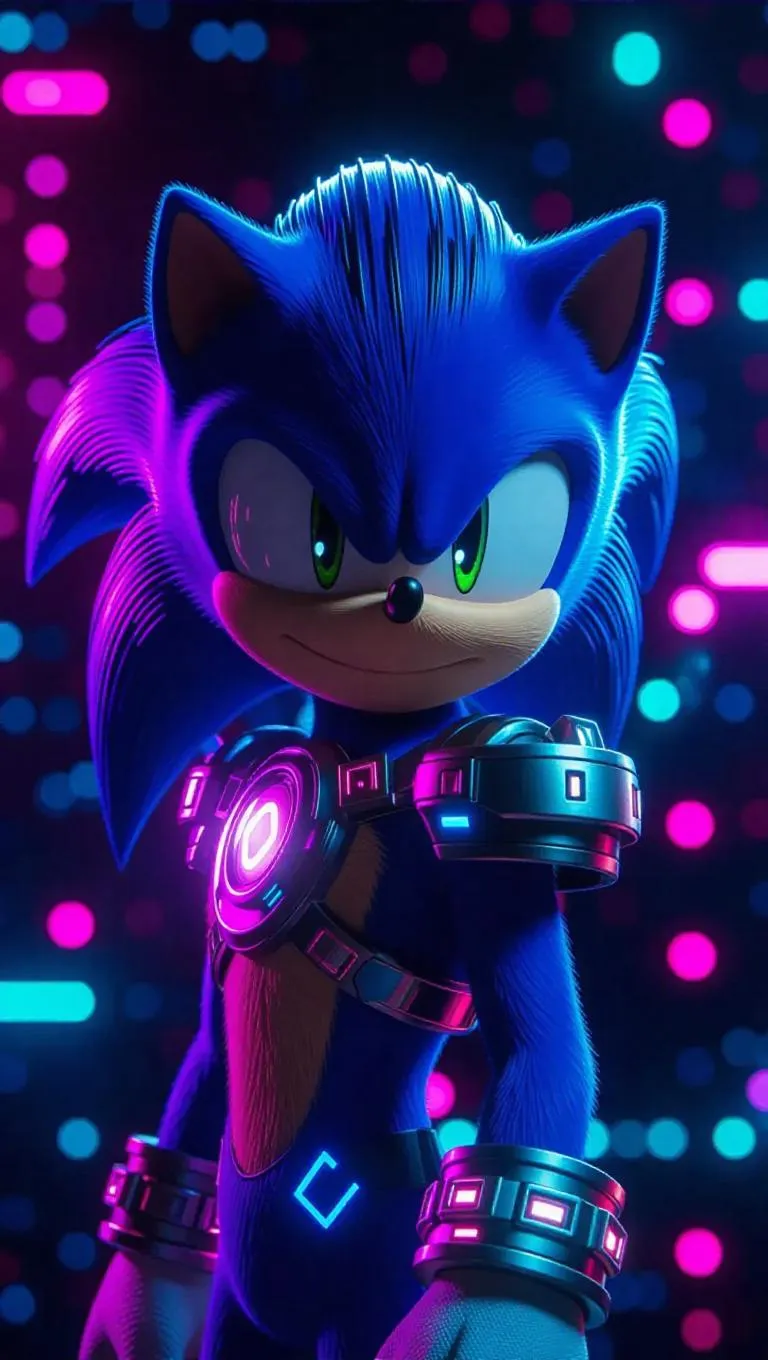 Sonic the Hedgehog, imagined as a digital avatar, wears pixelated shoulder gear, a virtual blade tail-blade, and neon glows. Dynamic anime-style motion lines and digital codes adorn the box art. The scene is set in a virtual reality world with grid patterns and floating elements. Bright neon light highlights the avatar design and enhances the vibrant, electric ambient lighting. The style fuses realistic and anime aesthetics, focusing on the interplay of gaming and animated visuals.