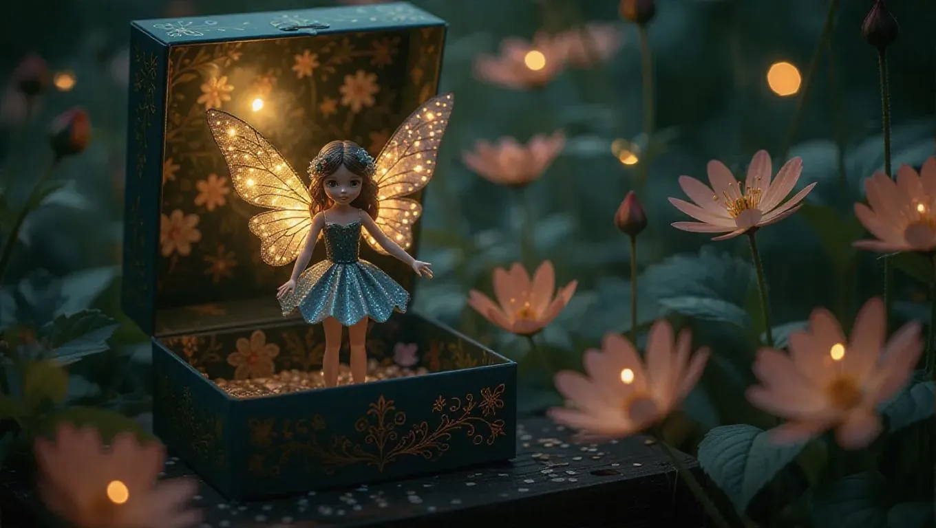 A toy fairy with shimmering wings and a floral dress poses on a magic dust-shaped platform inside her box. The packaging showcases a garden fairy tale design and a secret drawer filled with miniature flower seeds. Set in a mystical toy garden, the scene is filled with the soft glow of fireflies and the enchanting reflection of moistened petals, evoking a whimsical and magical atmosphere. The style combines realism with fairy-tale elements.