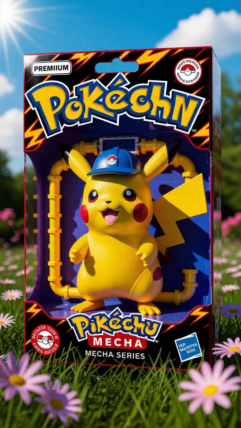 A steam-powered, anime-inspired toy figure of Pikachu as a plumber-bot, featuring electric yellow pipes, jet boots, and tail arms. The premium packaging showcases electric-themed coin textures, zappy overlays, and a “Pikachu Mecha Series” sticker. Set against a bright toy meadow with flowering grass, the scene is bathed in sunny, cheerful light with playful shadows, enhancing the retro-futuristic aesthetic.