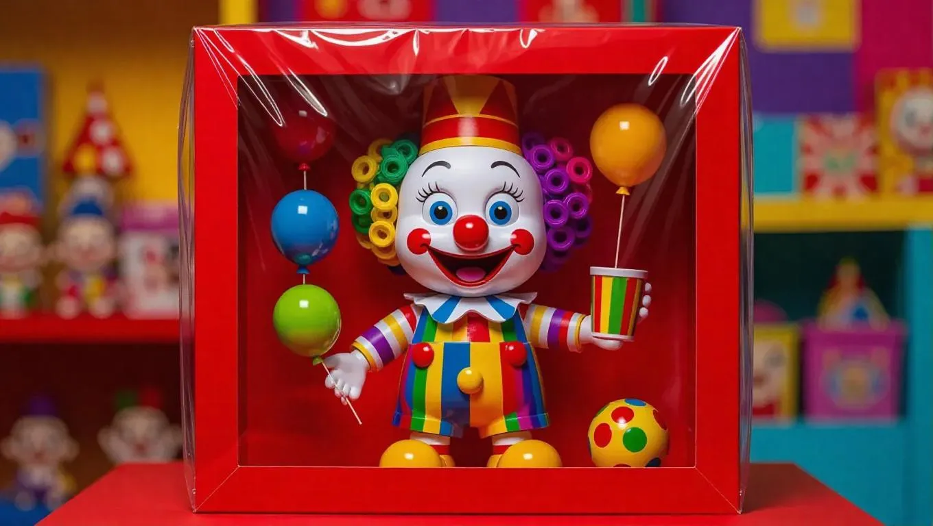 C4D, a crimson paper toy box is completely wrapped in transparent plastic film. The box body has a large observation window to show the inside. A 3D cartoon-style clown doll is wearing brightly colored overalls with a striped shirt, colorful curly hair, a big grin face with big blue eyes and exaggerated eyebrows, a clown cap and nose, holding a balloon cup, and wearing oversized shoes. The package contains two changeable clown caps and three pairs of funny shoes of different styles. The background features a playful toy store display stand in jubilant tones. The plastic packaging film reflects the ambient light, presenting a zany texture. The overall picture is full of the joy of a collectible figurine.