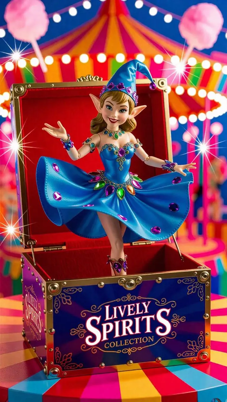 A collectible figure of a mischievous elf sorceress, posed in a cheeky stance with her silk gown festively twirling, adorned with colorful gaudy jewels. The toy box features vibrant red velvet textures, shiny toy motifs, and "Lively Spirits Collection" branding. The background is a playful fairground filled with bright lights and cotton candy. Bright, excited light shines around the figure, emphasizing her playful spirit. The style combines fantasy with carnival aesthetics, bursting with color and fun.