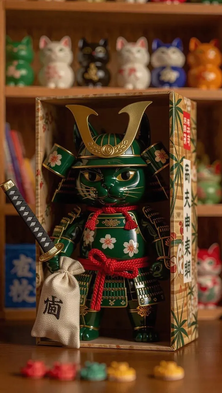 A samurai cat warrior toy clad in lacquered green armor adorned with floral motifs and twin blade tails. The box features bamboo illustrations, Japanese symbol stamps, and a cotton pouch. Set against a cozy crafting area with colorful toy shelves, the scene is illuminated by dim, warm light, casting soft shadows that enhance the toy's detailed craftsmanship. Style: Realistic.
