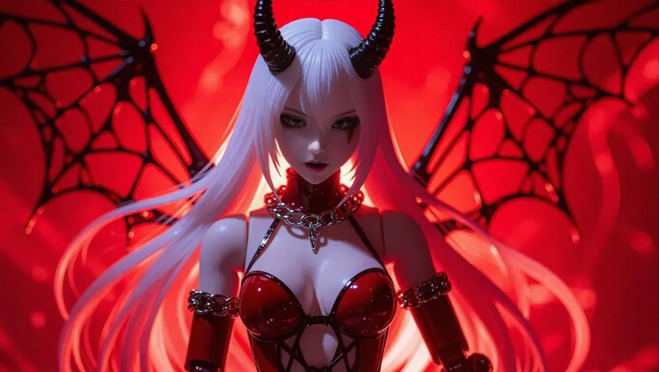 A seductive demon girl action figure with obsidian horns, moth wings, and a minimalist red latex outfit adorned with platinum chains. Her long, flowing white hair shimmers, and her blood-red eyes have an intense brightness. The toy packaging features cursed symbols, dark silk textures, and a transparent deep crimson window. In the factory, incandescent molds and ethereal vapor surround the assembly lines, creating a forbidden, enchanted atmosphere. Lighting is atmospheric with soft highlights and rich shadows. Style: Dark Fantasy, Gothic.