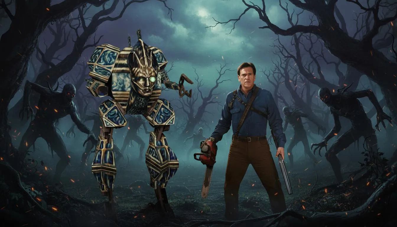 Generate a thrilling AI-generated visual of Ash Williams and a Combat Bot battling demonic forces in a sinister supernatural forest. Create epic sci-fi horror images with vivago.ai's powerful AI image generator. Perfect for fans of action-packed monster showdowns and dark fantasy settings.