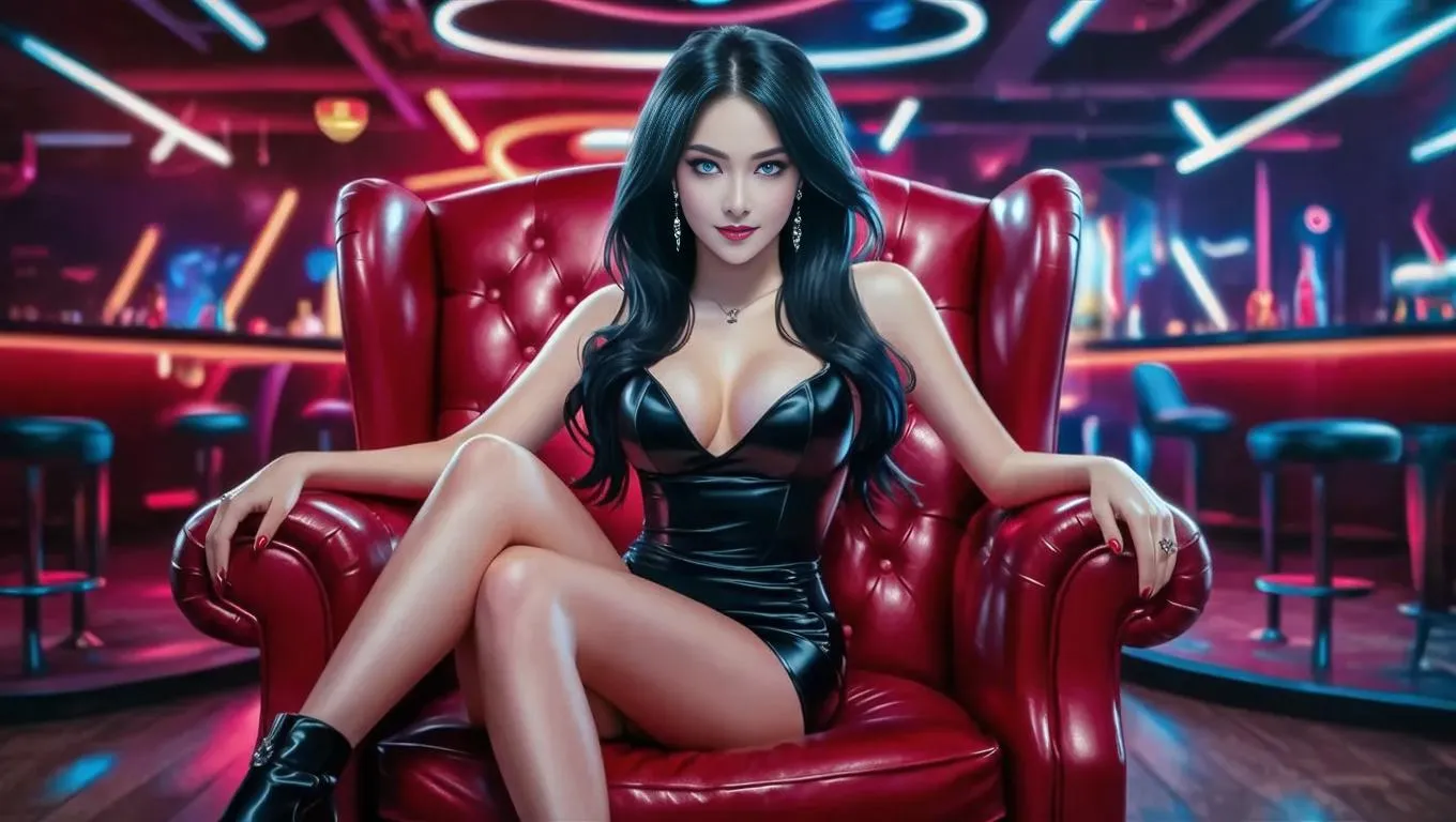 Generate a stylish AI image of a confident young woman with long black hair, blue eyes, and a short black dress, seated elegantly on a red leather chair in a vibrant club. Perfect for nightlife-themed visuals, fashion AI art, and modern digital storytelling with sharp, AI-enhanced details.